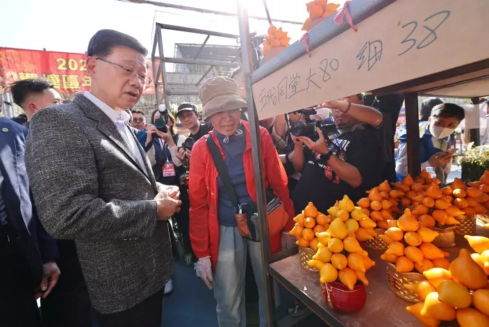 超哥期間也有問今年年宵的檔主市道狀況,並祝願大家「生意好」。期間有長者希望同他合照,特首爽快答應,更由麥美娟親自「揸機」。