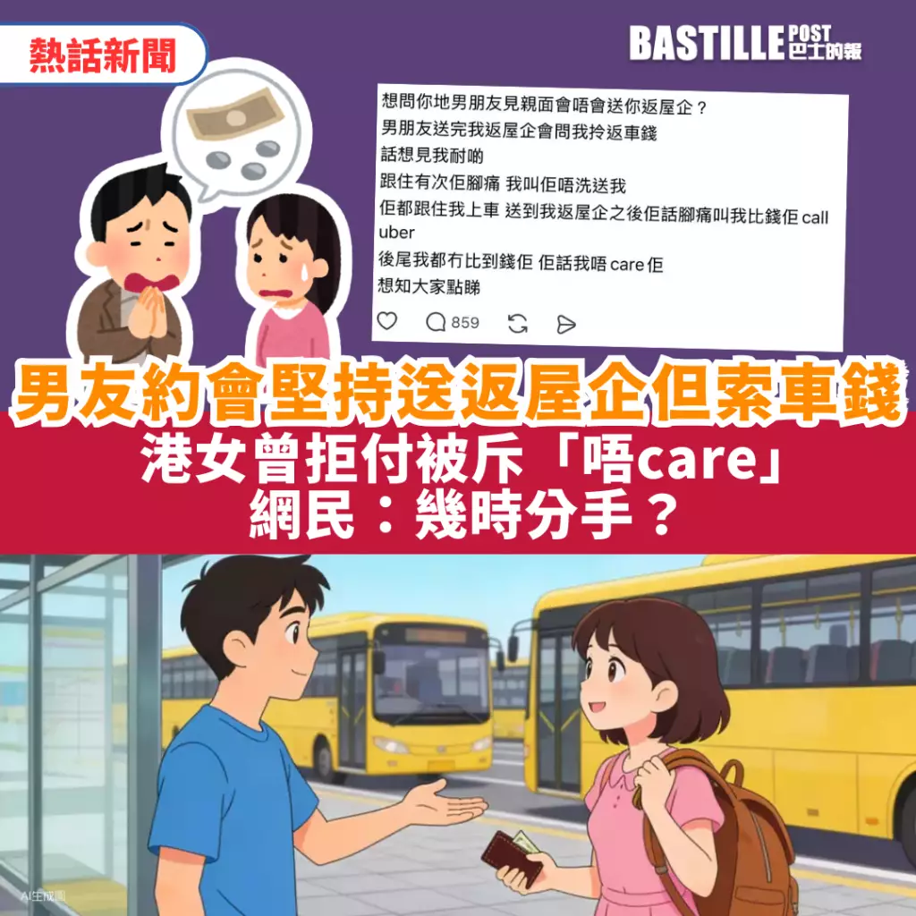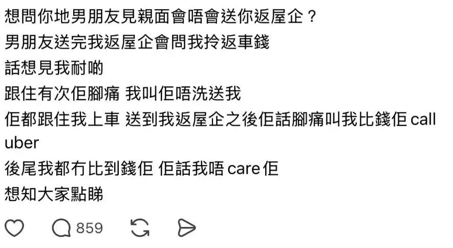 近日有港女在發文指,男友每次約會後雖堅持送她回家,但送到後竟主動索取返程車費,令她大感困惑,遂發帖詢問網友意見。事件引發廣泛討論。