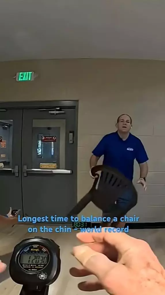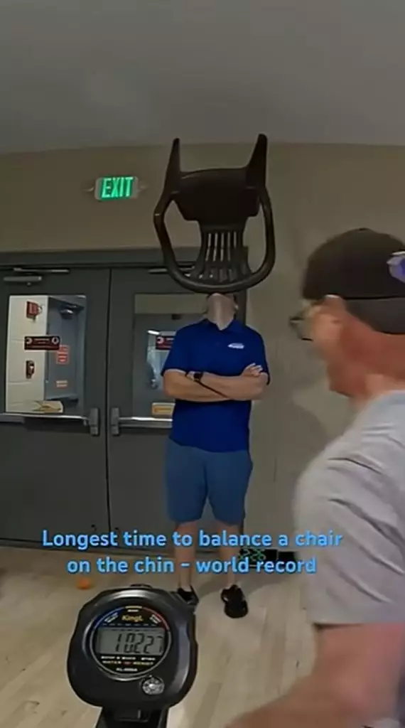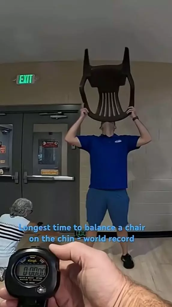 美挑戰達人忍痛用下巴「頂椅子」80分鐘,重奪健力士世界紀錄。IG影片截圖@recordbreakerrush