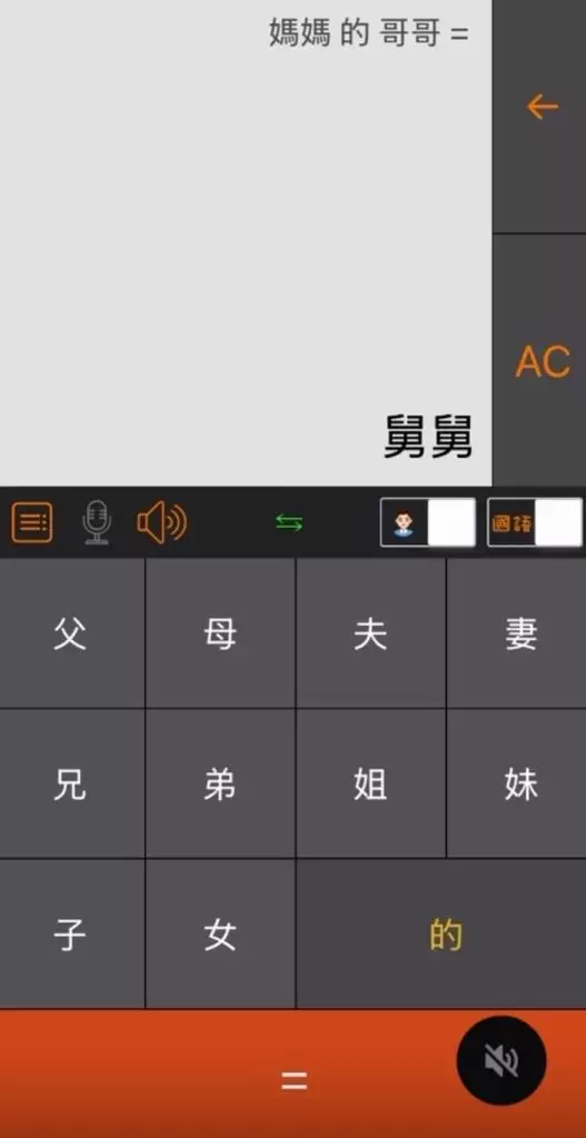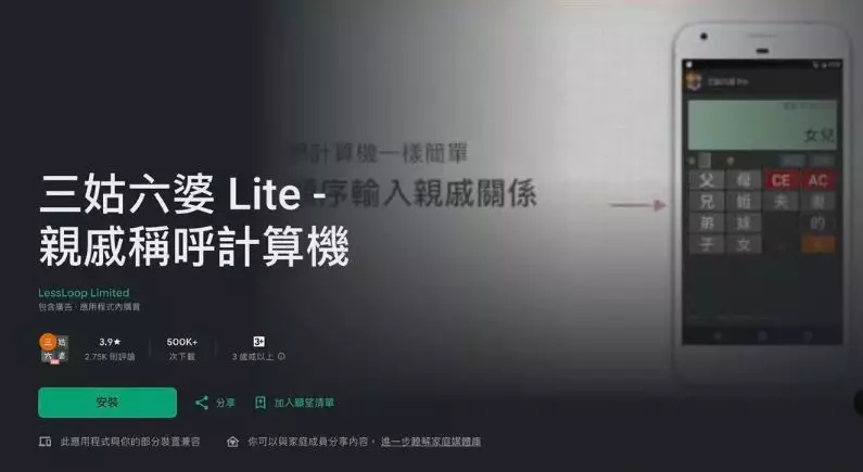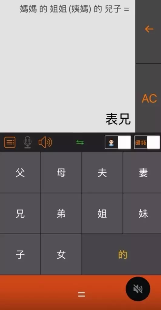 這款免費應用程式名為「老表你好-三姑六婆親戚稱呼計算機」。其介面設計模仿傳統計算機,將數字鍵替換為「爸爸」、「媽媽」、「哥哥」、「姐姐」等直系親屬稱謂鍵。使用者只需按照親屬關係順序點選,程式便會自動運算並顯示正確的稱呼。例如,輸入「爸爸的爸爸的妹妹」,結果即顯示為「姑婆」,操作直觀易懂。