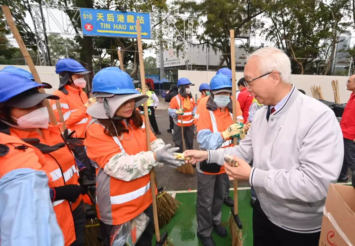 其中,環境及生態局局長謝展寰早上到維園年宵市場,探訪正在進行清理工作的食環署清潔員工,並派發朱古力向他們致謝。謝展寰說,食環署在年宵市場舉行期間,安排承辦商做好分類回收,將相關回收物送往環保署指定的設施,做到資源循環和轉廢為材。
