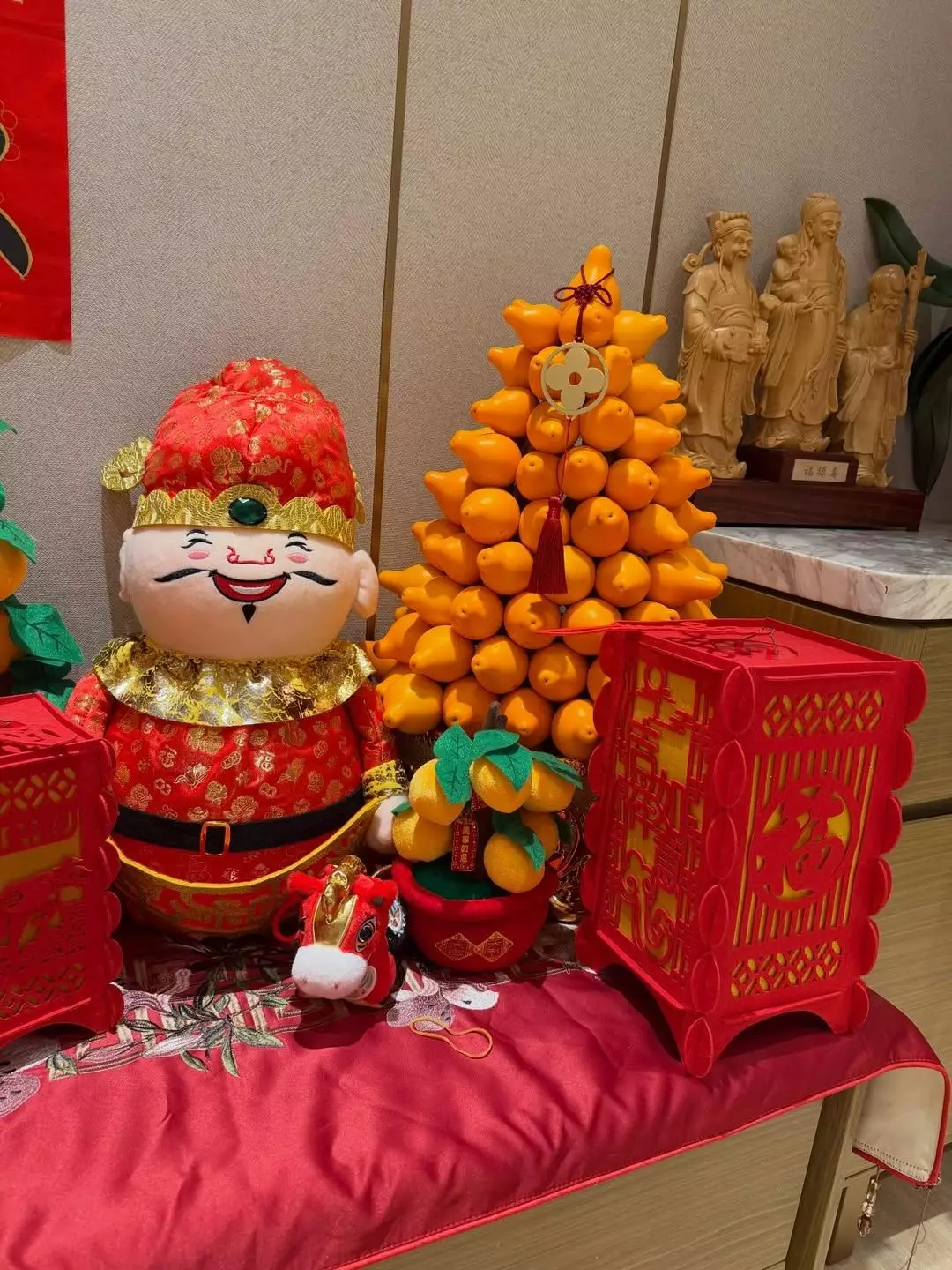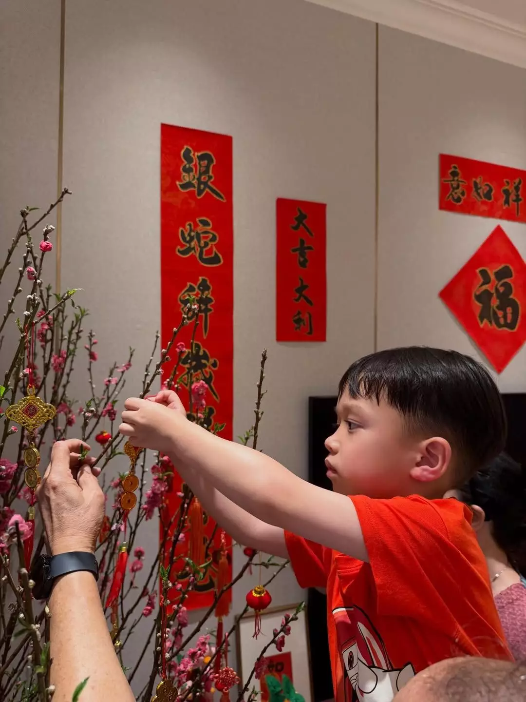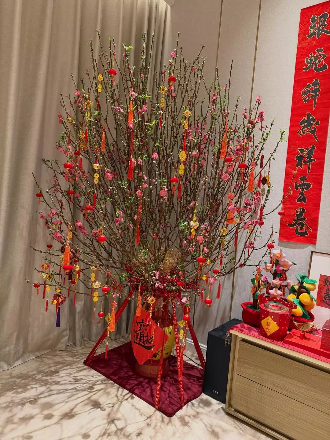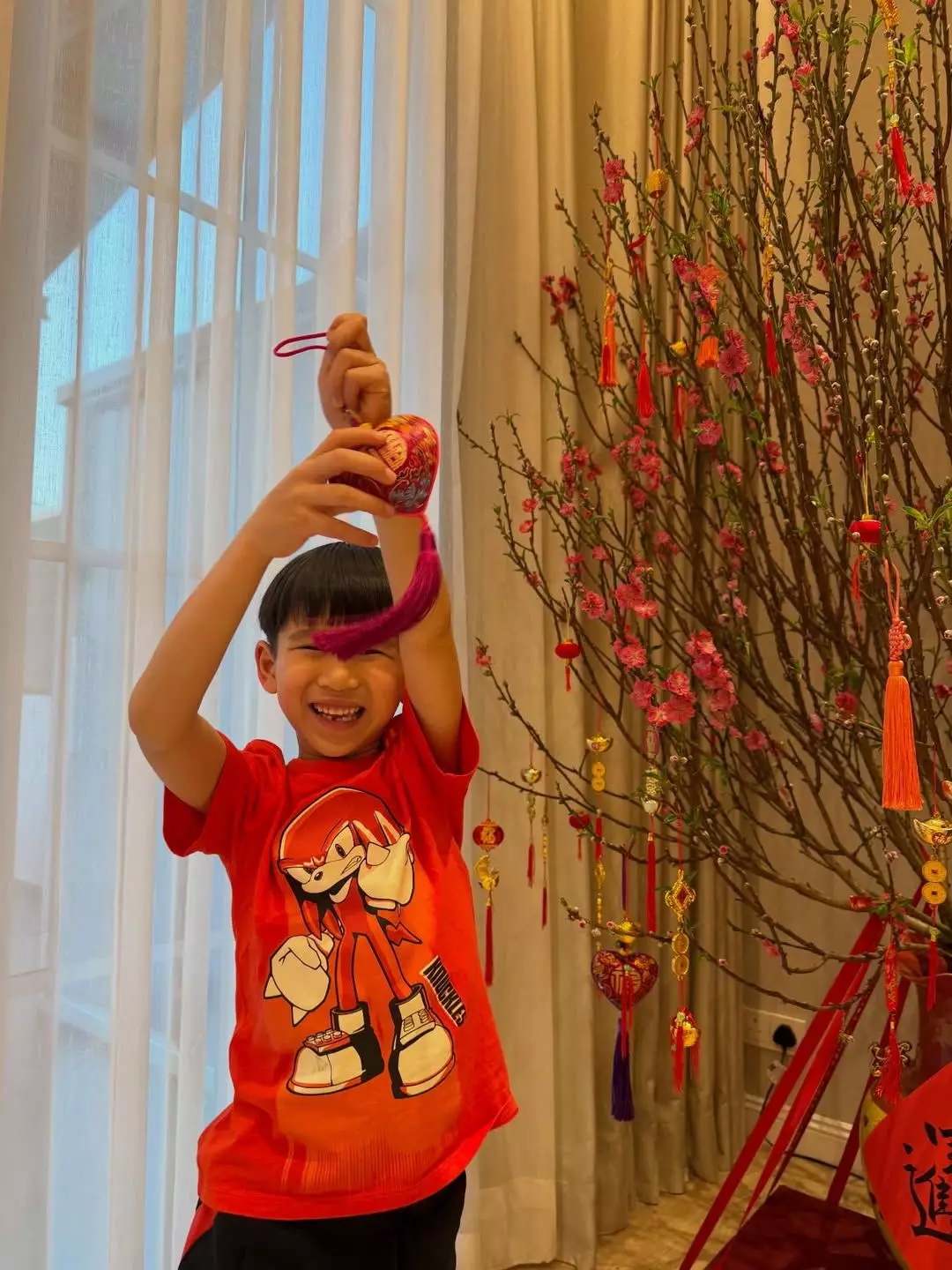 胡杏兒在IG分享回圍村的照片,並留言:「馬年啦,我們準備好了,放馬過來吧!!」相中可見,胡杏兒不但擺擔挑上膊,又拿着上誠心祈福,三個囝囝亦乖乖跟着上香。回家後,一家五口齊齊佈置家居,可見家中除了有各式各樣的揮春,還擺放了一大棵桃花,以及寓意金玉滿堂、富貴發財的年花「五代同堂」,更有豐富的團年飯,滿滿新年的喜慶氣氛!