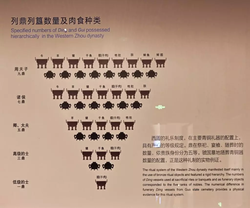 西周飲食禮儀的核心,就是「等級分明」,而最直觀的體現,就是「列鼎制度」。所謂列鼎制度,就是根據貴族的爵位等級,規定宴飲和祭祀時使用鼎的數量,具體來說:天子用九鼎八簋,諸侯用七鼎六簋,大夫用五鼎四簋,士用三鼎二簋,而平民則不能用鼎,只能用簡單的陶器盛放食物。這裡的鼎,是用來盛放肉食的器具,簋則是用來盛放主食的器具,鼎和簋的數量越多,代表身份越高貴。《周禮·天官·膳夫》中明確記載「天子日食少牢,朔月太牢;諸侯日食特牲,朔月少牢」,所謂太牢,就是牛羊豕三牲俱全,少牢則是羊豕二牲,特牲則是豬一牲,這與列鼎制度相互對應,形成了嚴格的飲食等級規範。