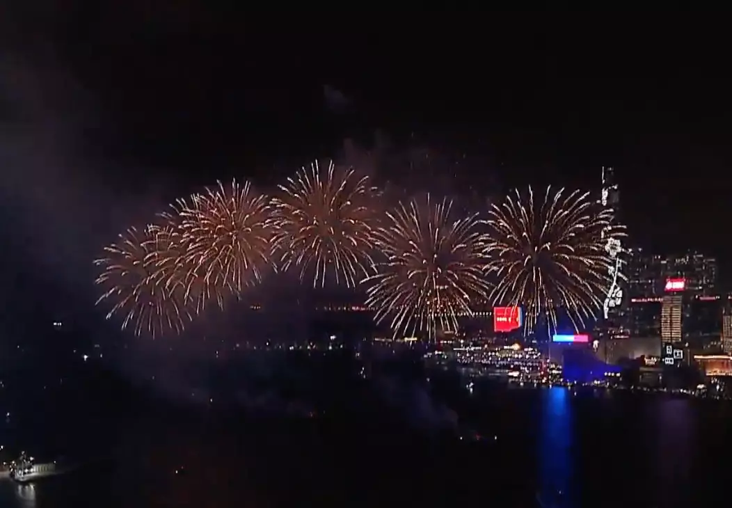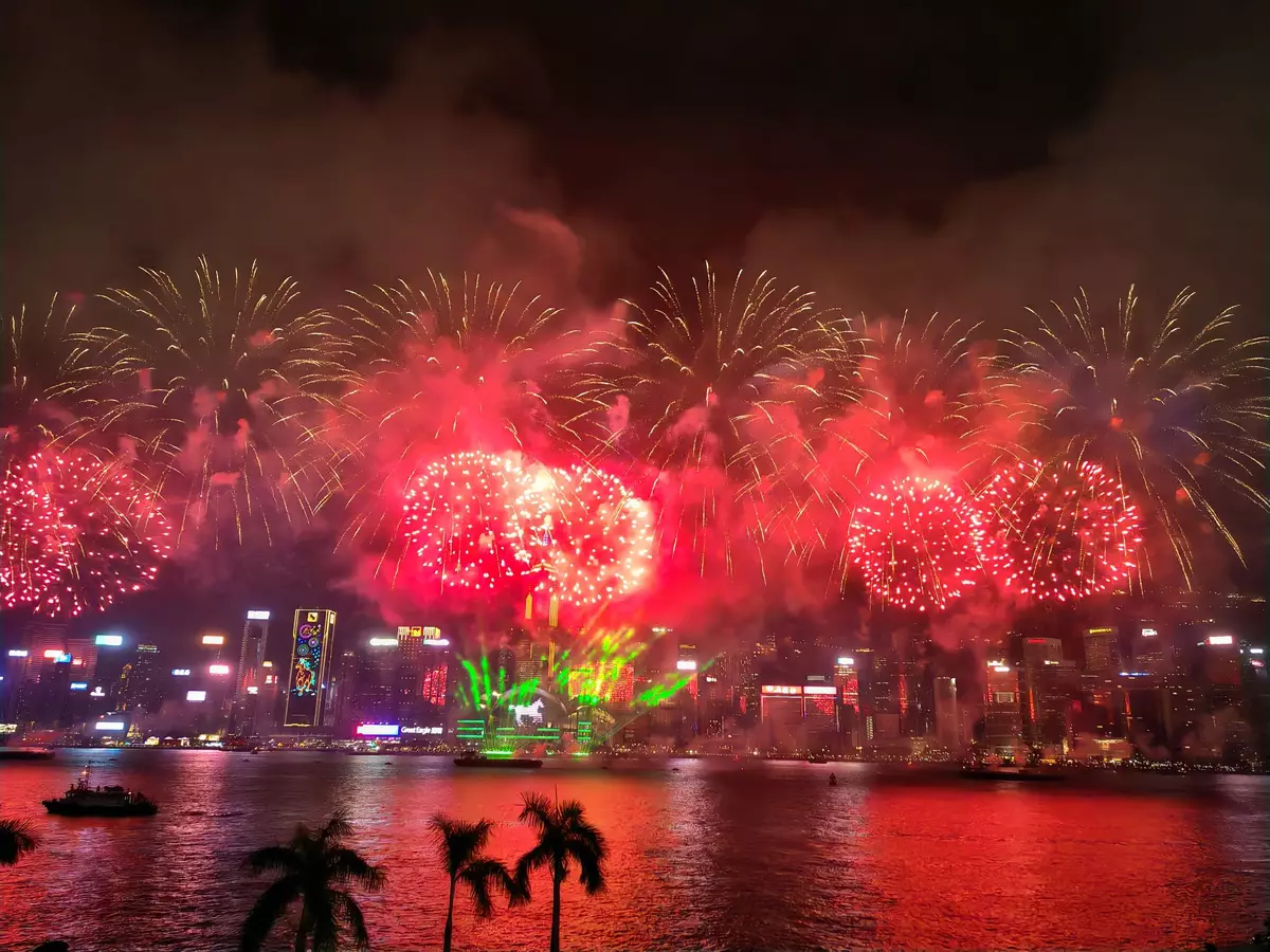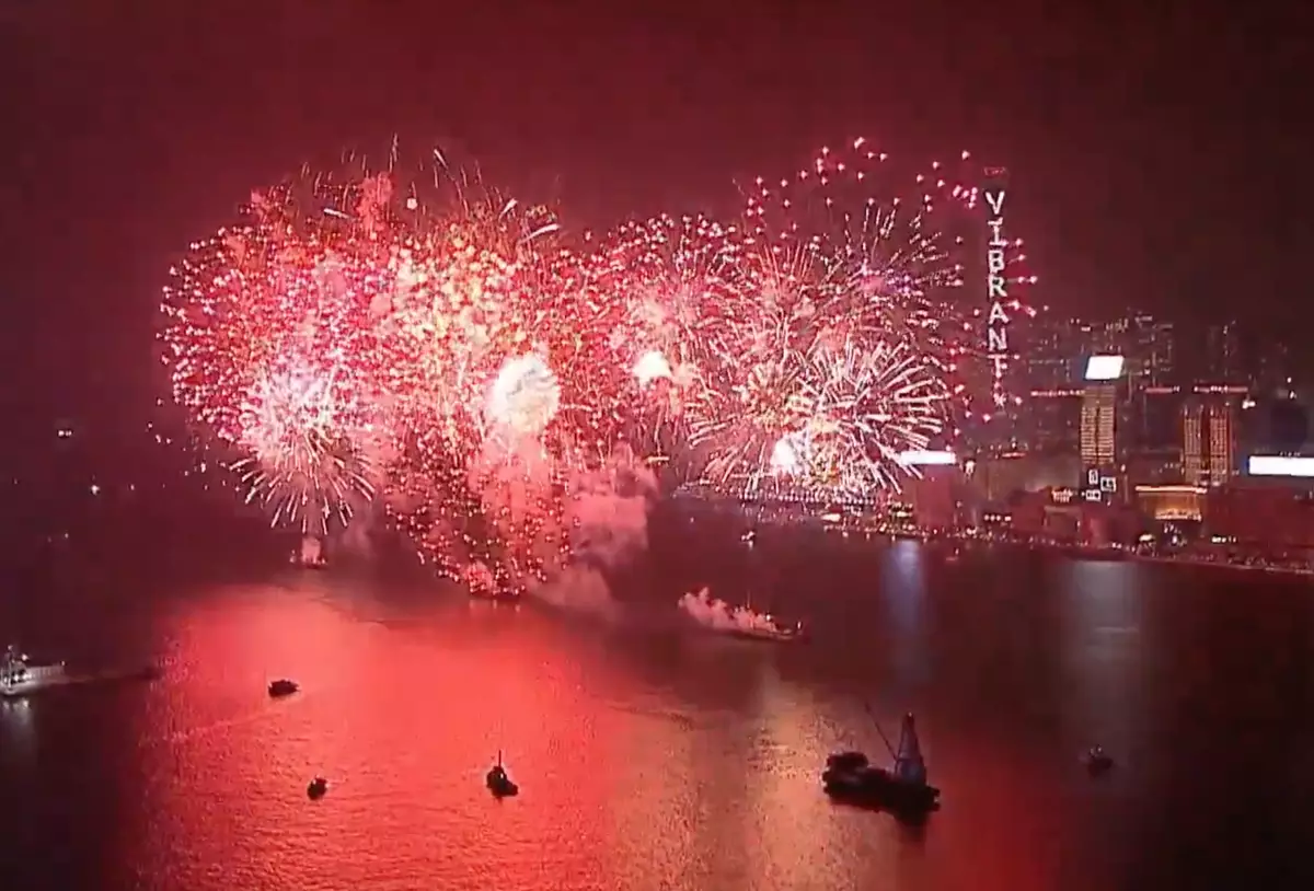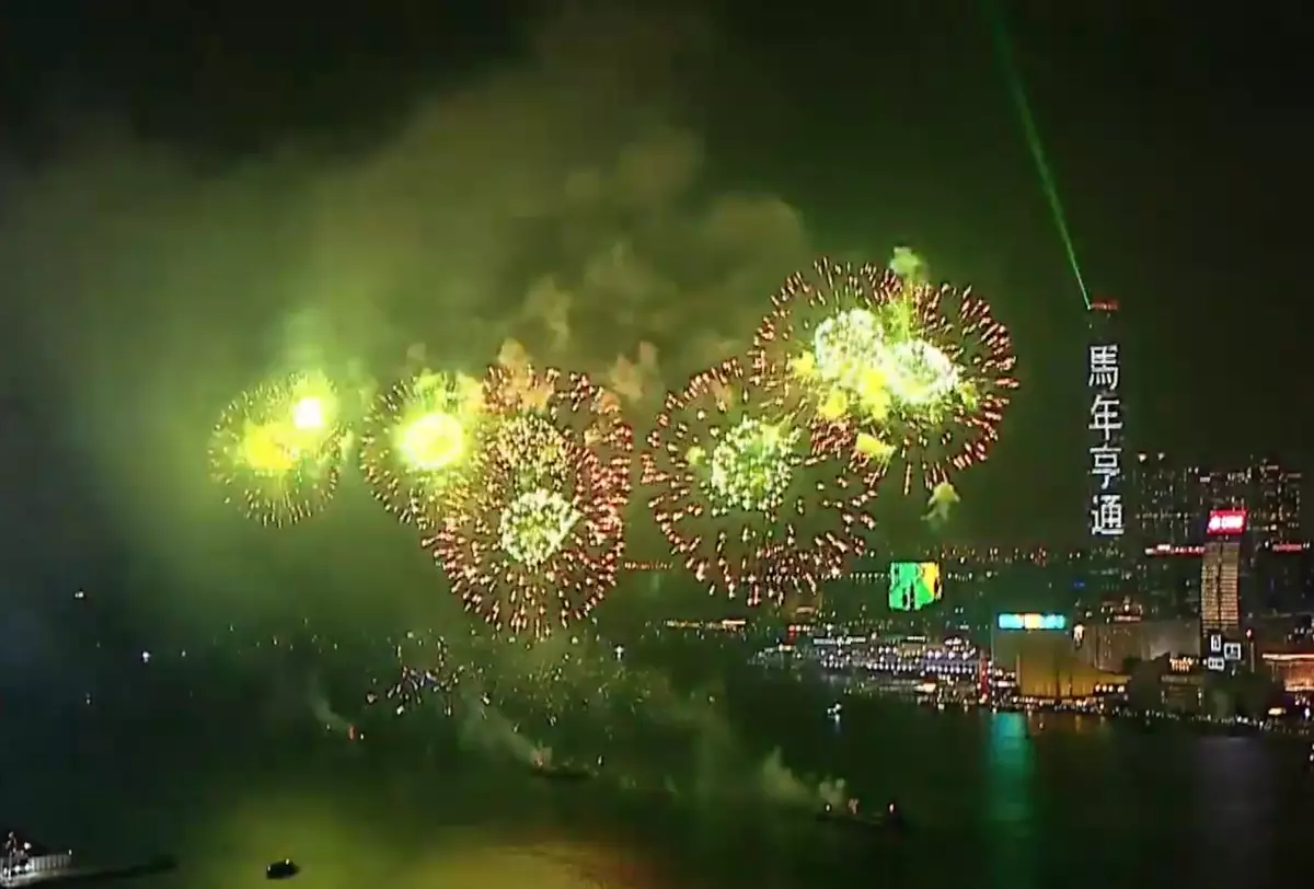 香港賽馬會獨家贊助的「馬到功成耀香江」馬年煙花匯演,晚上8時開始在維多利亞港上空綻放壯麗的煙花。31888枚煙花照亮維港,以萬馬奔騰的磅礡氣勢迎接馬年。