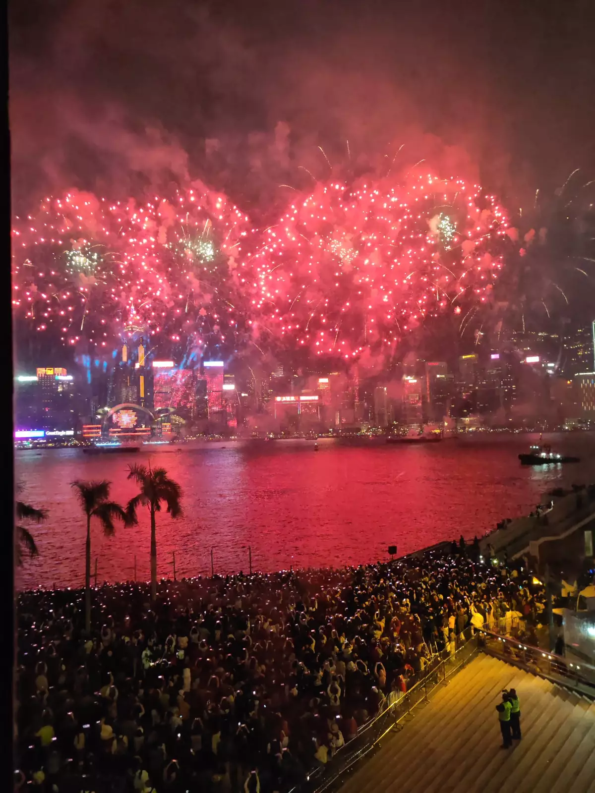 市民在灣仔海傍欣賞煙花。讀者提供