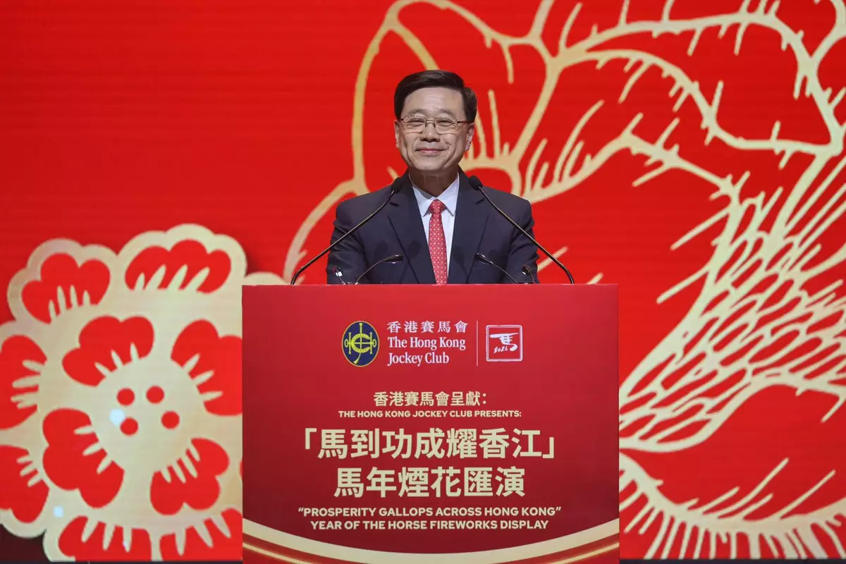 一眾嘉賓在煙花匯演開始前,在香港會議展覽中心參與馬會舉辦的儀式。主禮的行政長官李家超致辭時表示,今年是國家「十五五」規劃的開局之年,香港必定馬不停蹄、改革求進,主動對接「十五五」規劃,積極融入國家發展大局,繼續發揮香港在「一國兩制」下「背靠祖國、聯通世界」的獨特優勢,為國家高質量發展貢獻香港力量。他感謝香港賽馬會贊助今晚的煙花匯演,為馬年增添祝福和喜悅;並祝願祖國繁榮昌盛,香港百業興旺。