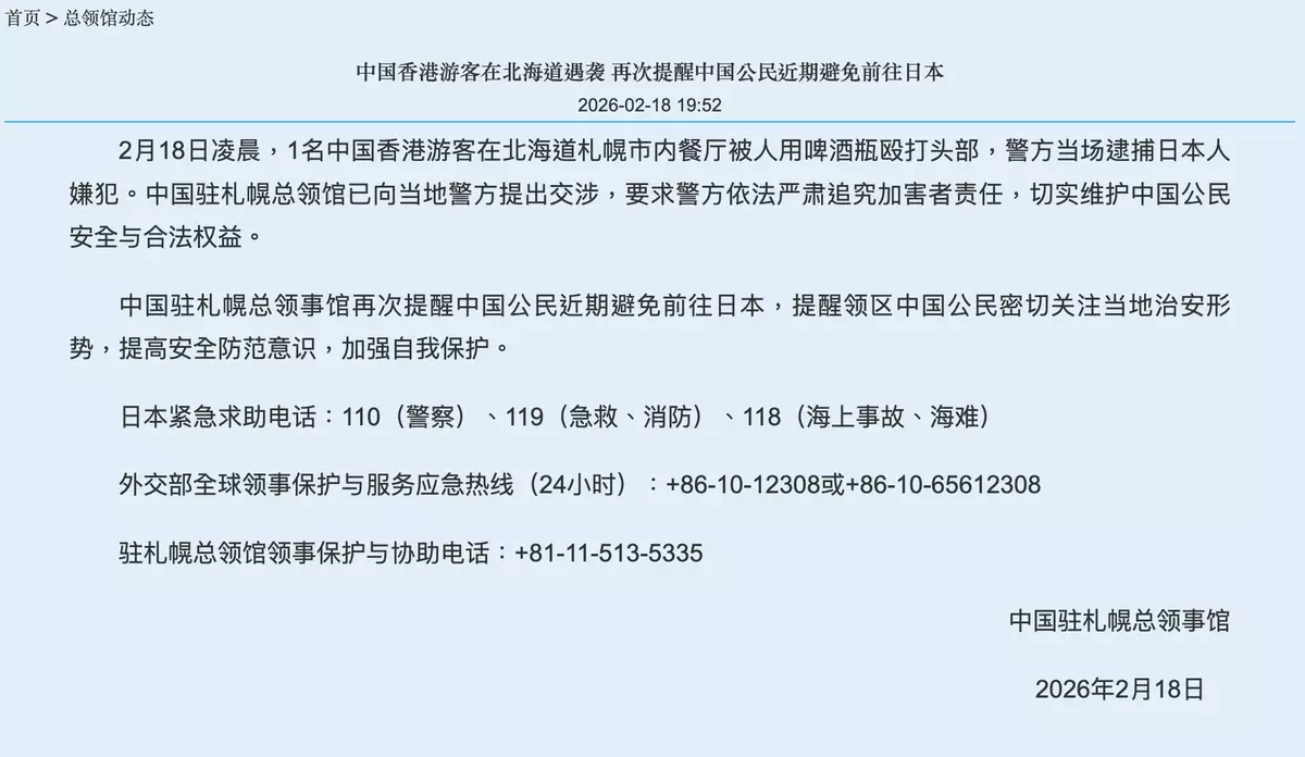 中國駐札幌總領館發出的通告。官網圖片