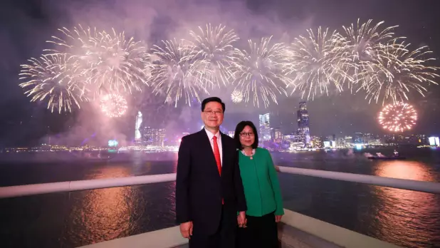 李家超與夫人到灣仔會展觀賞煙花,稱八幕匯演呈現萬馬奔騰的磅礡氣勢。(李家超社交網站圖片)