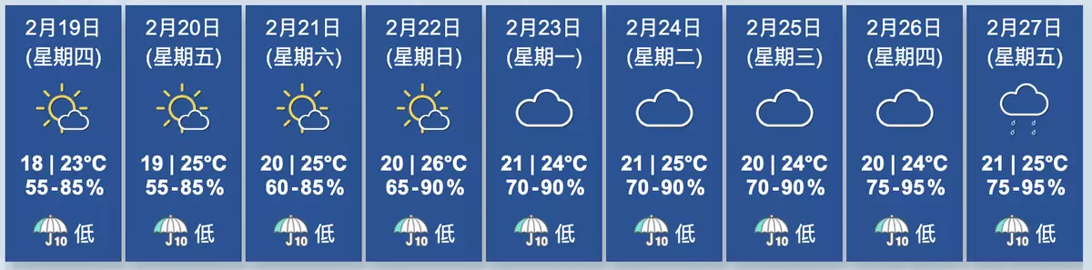 展望初四及周末期間部分時間有陽光,日間溫暖。下周初大致多雲。