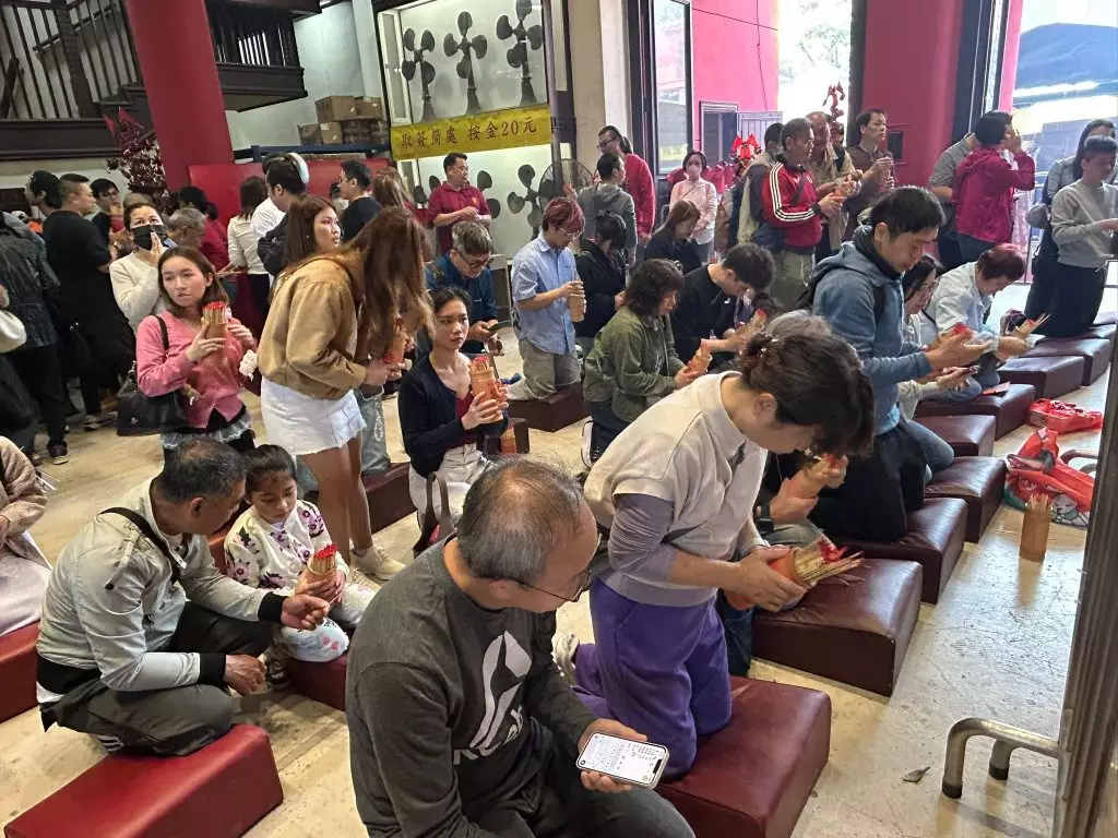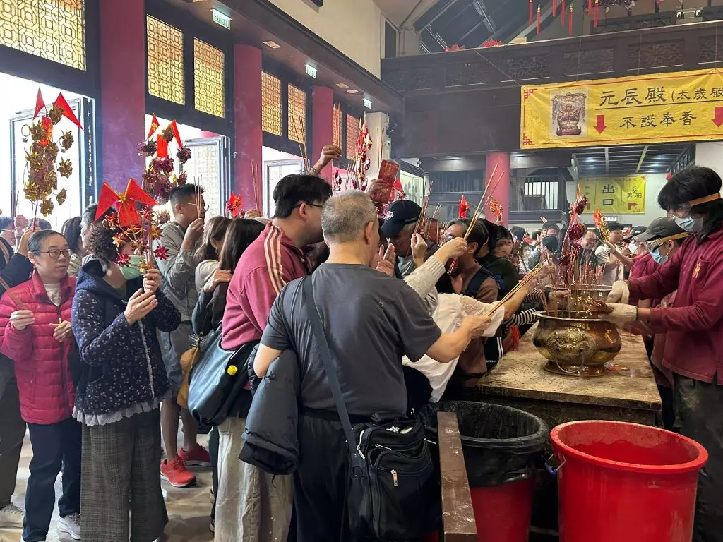 廟內香火鼎盛,沿途轉運風車隨風而動,善信們耐心排隊,依次進廟,誠心上香,祈求新的一年順景平安,萬事如意。不少善信亦在廟內求籤祈福,希望新的一年可以求得吉簽,獲得開頭好兆頭。