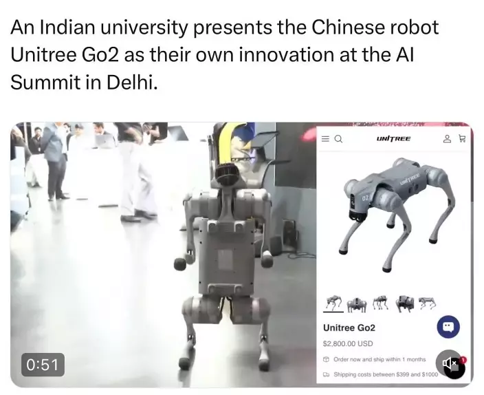 2月16日在印度新德里開幕的「印度人工智能(AI)影響力高峰會」(India AI Impact Summit),號稱雲集了許多印度企業、院校、科研機構在AI和機器人的最新研究成果,向世界展現印度的科研實力,引起全球關注,惟卻爆出學術造假醜聞。《印度時報》18日報道,印度加爾戈蒂亞斯大學(Galgotias University)在峰會上展出的一隻機械狗,被發現是市面上已有售的中國宇樹科技生產的Unitree Go2產品,其後被逐出會場。此外,還有人發現峰會現場,竟出現一隻手搓的泡沫塑膠無人機,還用粗糙的膠布貼黏着,震驚網民。