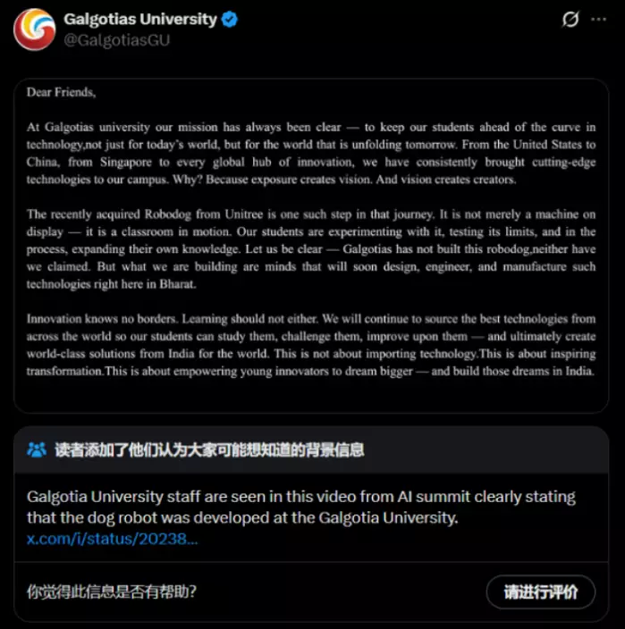 不過,X在這份聲明下附加了註釋和視頻鏈接,指校方的說法「並不符合事實且具有誤導性」,該校的工作人員的確號稱機械狗是該校團隊開發的。