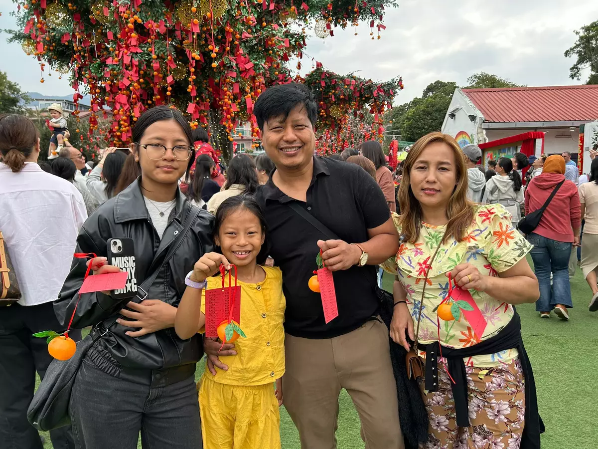 來自尼泊爾的Niraj一家今年是第二次參加林村的許願節活動,兩次體驗都讓他感到非常開心。對他而言,可以在新年伊始,通過往許願樹上拋寶牒的方式,是非常難得的香港文化體驗。掛在樹枝上的橘子不僅顏色亮麗,而且寓意吉祥,是很好的新年風景。對於新的一年,他希望可以闔家健康平安,財源廣進。