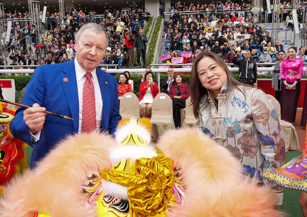 文化體育及旅遊局局長羅淑佩(右),與香港賽馬會行政總裁應家柏在2026馬年賽馬日開幕典禮主持醒獅點睛儀式。香港賽馬會圖片