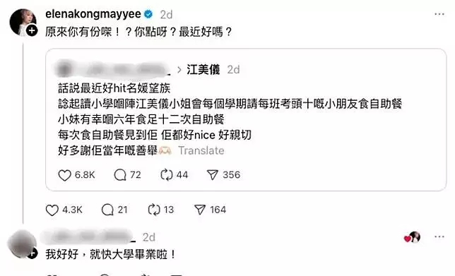 江美儀本人亦親自留言回應,關心該位網民近況:「原來你有份㗎!?你點呀?最近好嗎?」對方回覆:「我好好,就快大學畢業啦!」短短互動,盡顯江美儀親切真性情。