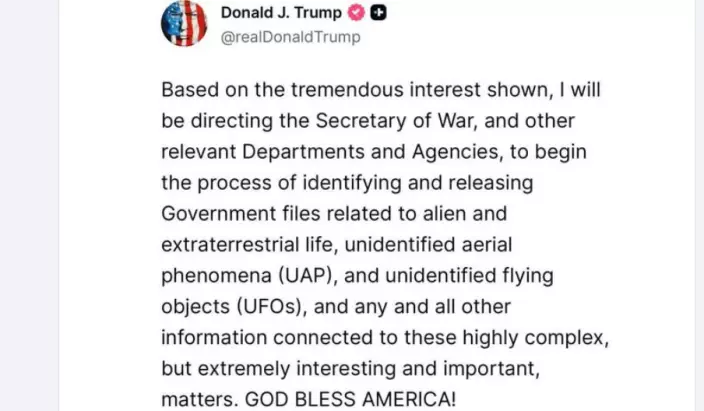 美國總統特朗普在社交平台發文表示,鑑於公眾表現出的極大興趣,他將指示國防部長及相關部門與機構,啟動識別並公佈與外星生命、不明空中現象(UAP)以及不明飛行物體(UFO)有關的政府文件。