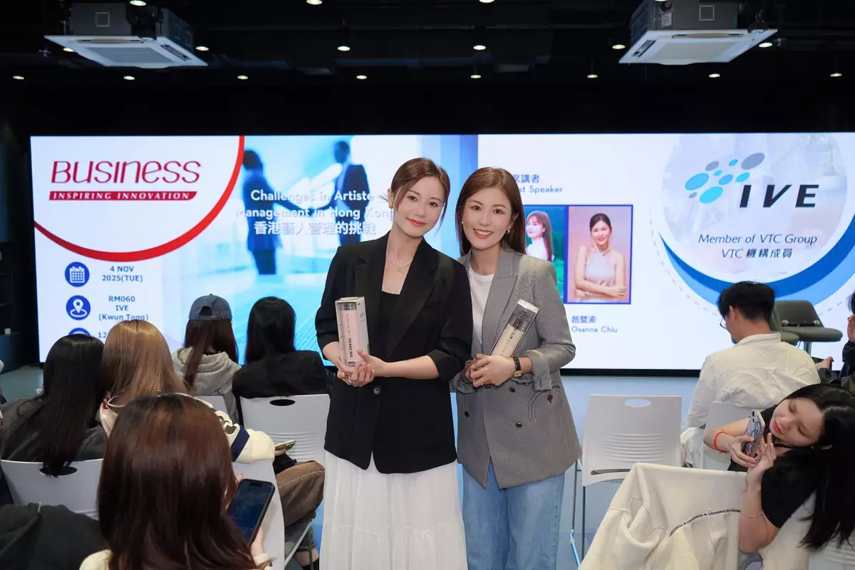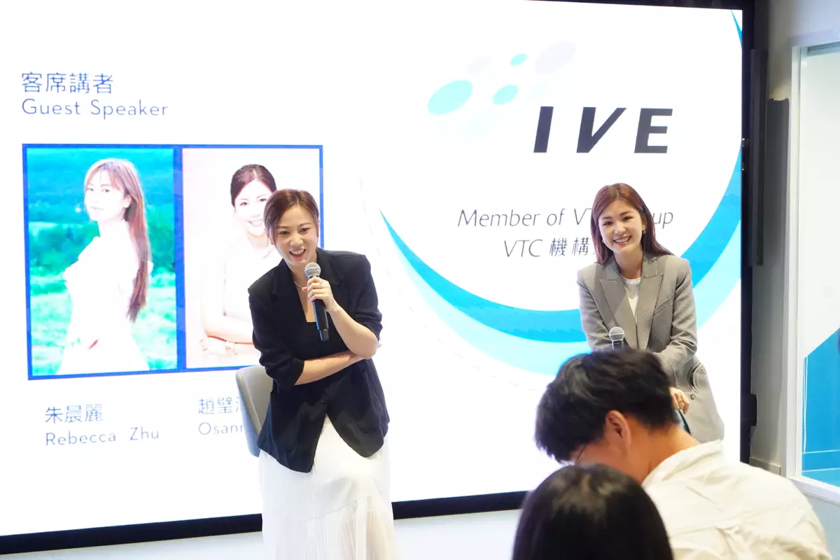 無綫選美冠軍朱晨麗與藝人趙璧渝(Osanna),早前到香港專業教育學院 IVE(觀塘),為「BUSINESS INSPIRING INNOVATION-香港藝人管理的挑戰」擔任客席講師。在歷時兩小時的講座,與數十位莘莘學子分享演藝生涯,也談及初入行時種種困難及挑戰。首次做客席講師的朱晨麗和趙璧渝,面對學生們的積極發問皆盡力解答,更與學生打成一遍,足見兩人不止演戲出色,亦擅長與年輕人相處。