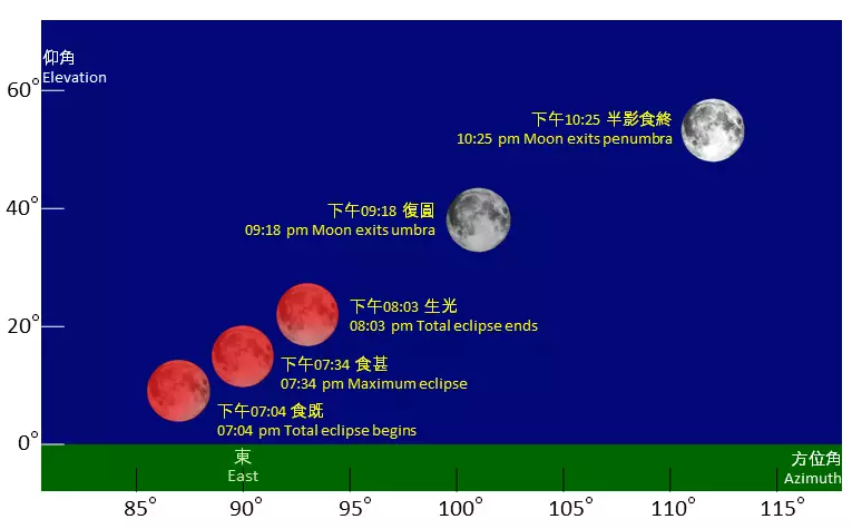 天文台表示,當晚月出時間為傍晚6時22分,月出前部分月球已經進入地球本影,晚上7時04分月球完全進入地球本影,即月全食開始,食甚時間為晚上7時34分,至8時03分月球開始離開地球本影。
