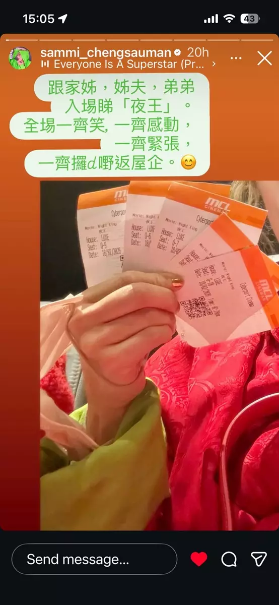 Sammi過年前馬不停蹄完成一連串宣傳後,趁新年假期跟家人一齊入戲院捧V姐(Sammi飾)場,笑住迎馬!在社交平台分享跟家姐,姊夫,弟弟入埸睇《夜王》,全場一齊笑,一齊感動,一齊緊張,一齊攞啲嘢返屋企。Sammi並稱:「由開拍到前陣子瘋狂式緊密宣傳工作,一切一切記憶猶在。一步一腳印。點滴在心頭。歡哥V姐跟東日的仝人(包括太子峰)衷心多謝每一位的入埸。這部電影是我們的共同結晶品。才公映兩天,路仍漫長,繼續一步一腳印。」