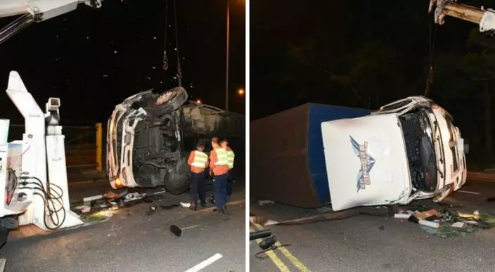 北大嶼山一部中型密斗貨車,凌晨疑閃避切線車輛失事翻側,司機受傷送院。
