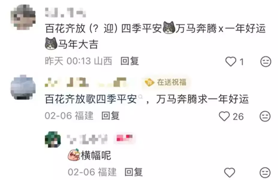 揮春的橫批是「馬年大吉」,上聯和下聯分別以「萬馬奔騰期一年好運」和「百花齊放迎四季平安」為主題。微博圖