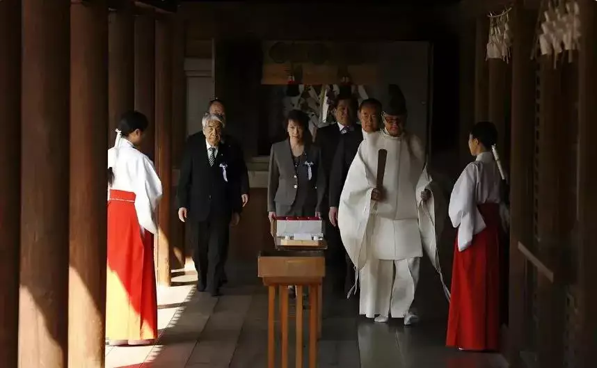 日本首相高市早苗(中)上台後,中日關係日趨緊張。圖為2007年8月15日,時任安倍內閣大臣的高市早苗參拜靖國神社。資料圖片