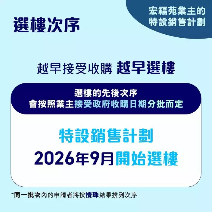 選樓次序將根據業主接受收購的日期分批決定,越早接受收購,越早選樓。6月30日或之前決定並簽訂臨時買賣合約的業主,將會率先揀樓。業主需於8月31日或之前確定意向,而「特設銷售計劃」將於9月開始選樓。兩個預計可在2026年第四季入伙的項目分別為房委會「綠置居2025」的九龍灣盛緻苑項目、房協的粉嶺百和路項目。