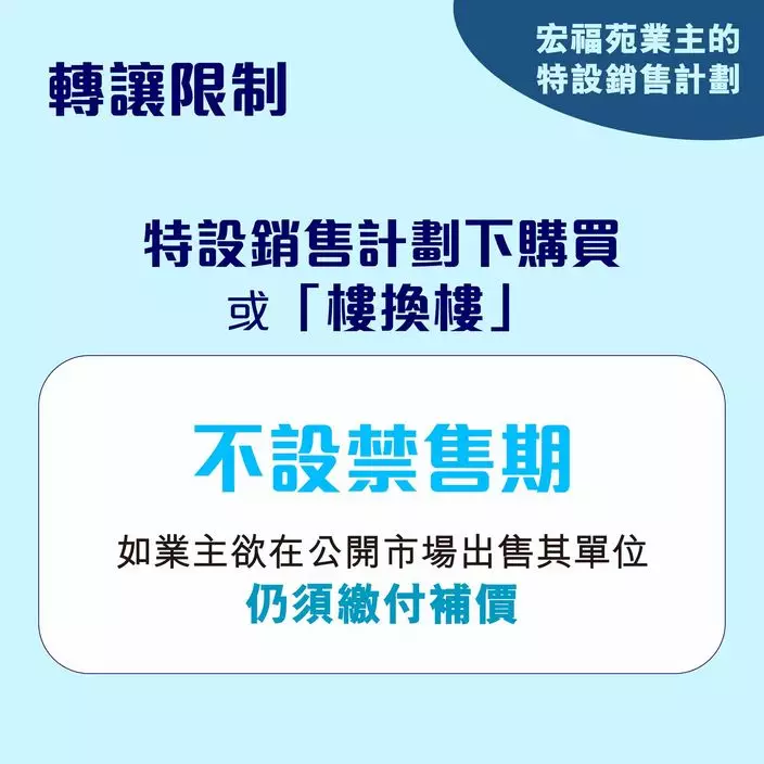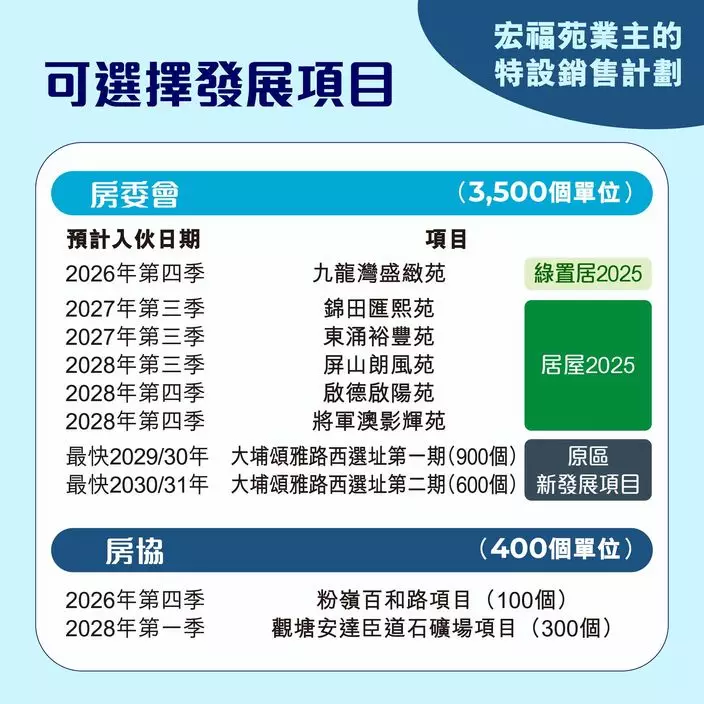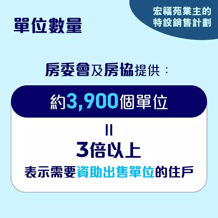 業主除了可以在取得收購金額後,自行作長遠居住安排外,亦可以參加特區政府為宏福苑業主而設的「特設銷售計劃」,房委會與房協會合共提供約3900個新單位,數量相當於有意選購資助出售單位住戶的3倍以上,供應充足。