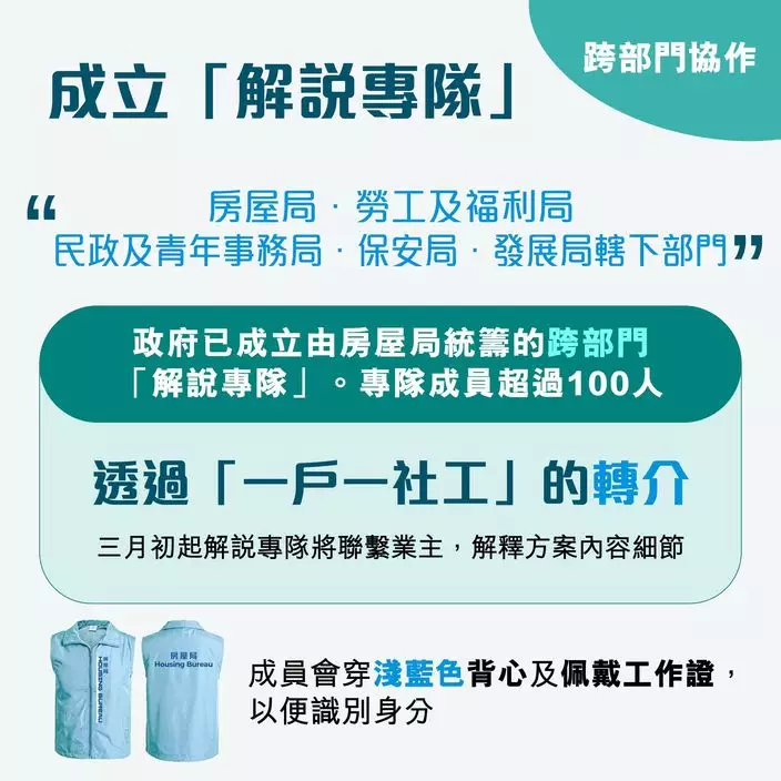 為協助居民更清楚了解方案細節,特區政府已成立由房屋局統籌的跨部門「解說專隊」,來自房屋局、勞工及福利局、民政及青年事務局、保安局及發展局轄下部門,專隊成員超過100人。解說專隊將透過「一戶一社工」轉介,於下月初起聯絡業主,解釋方案內容細節。