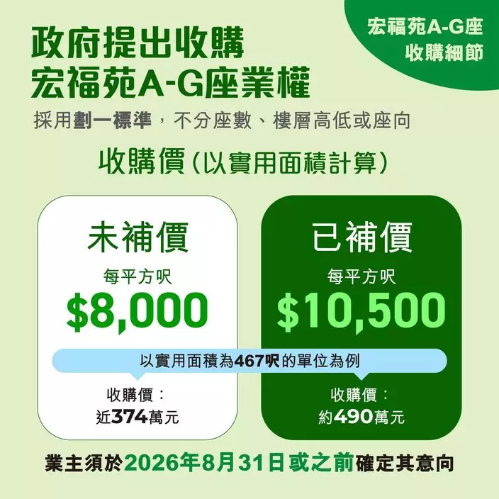 特區政府採用劃一標準,向宏福苑A至G座的業主提出收購,未補地價單位的統一收購價為每平方呎8000元,已補地價單位則為每平方呎10500元。業主需於今年8月31日或之前回覆意向。