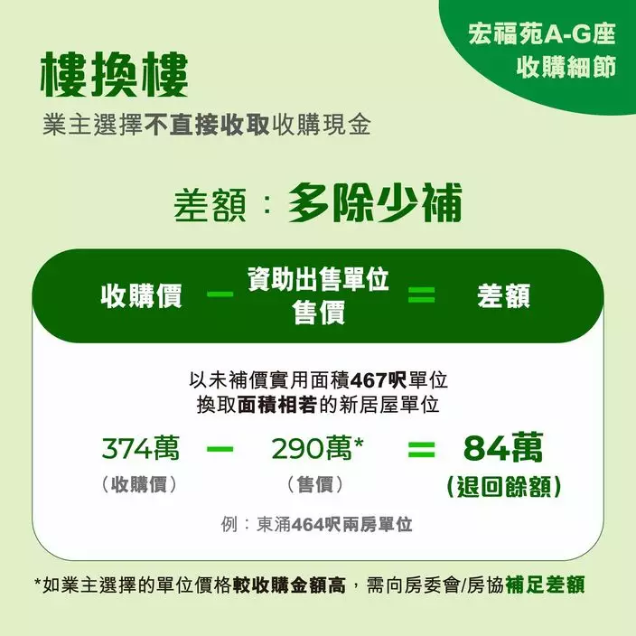 如果業主不希望處理大量現金,亦可選擇「樓換樓」,以「多除少補」方式向房委會或房協換購資助出售單位。