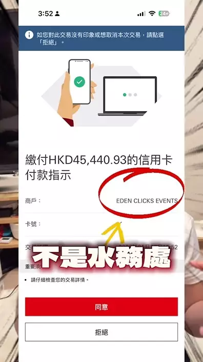 不料進入網上銀行頁面後,金額竟然顯示為 HKD 45,440.93,而商戶名稱亦非水務署,而是陌生的 「EDEN CLICKS EVENTS」。陳欣茵即時起疑,立刻拒絕付款,才沒有即時被騙。