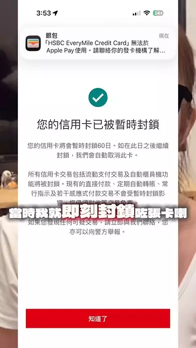 陳欣茵隨即封鎖信用卡,並即時致電滙豐銀行的防詐騙熱線處理。銀行即時為她取消原有信用卡,檢查帳戶是否有可疑交易,幸好最終未有任何金錢損失。