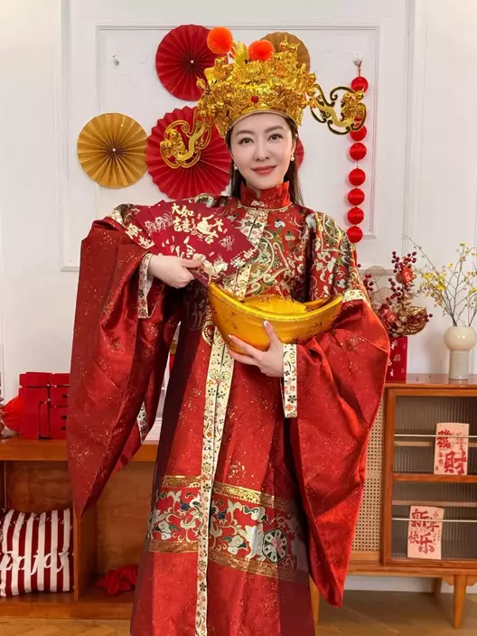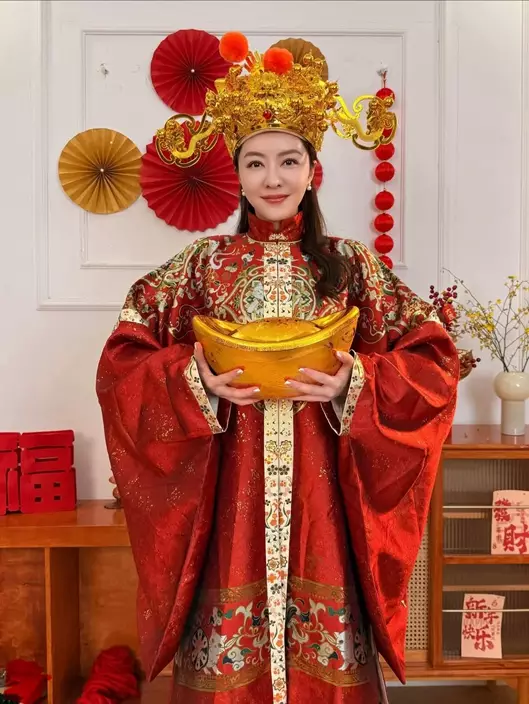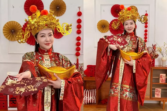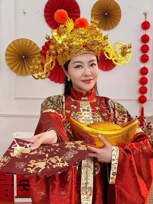 相中所見,熊黛林頭戴金光耀眼的財神帽,閃閃生輝,一手捧着大大個金元寶,另一手則拿着一大疊利是,造型喜慶又有心思。雖然已為兩女之母,但她依然明艷照人,獲網民大讚「最靚女財神」。她發文祝願大家新一年財源滾滾,齊齊沾上好運。