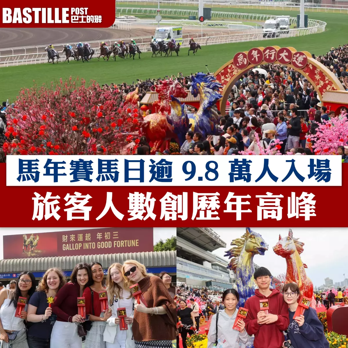 「馬年賽馬日」在沙田馬場舉行,吸引逾98000多人入場共賀新歲,當中內地及海外旅客人數更刷新歷來賽馬日紀錄,超過20000人。