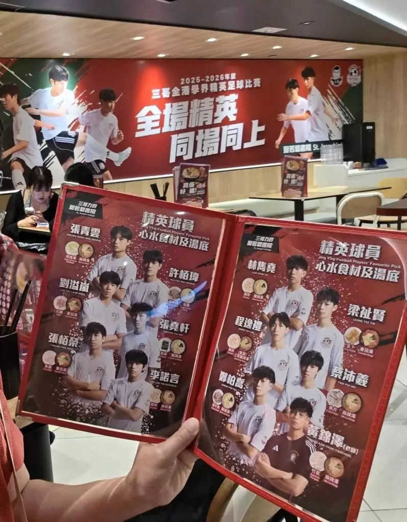 與此同時,這股熱潮延伸至日常。冠名贊助商譚仔三哥米線連續第二年支持賽事,以「全場精英同場同上」傳遞訊息,呼應「踢出辛巔峰」的青春拼搏。球場外的應援別具心思:部分分店化身學校主題空間,佈置打卡位與打氣口號,讓球迷、校友、親友在用餐時重溫學校榮耀。期間限定聯乘adidas的「精英賽打氣套餐」—自選兩餸米線配土匪雞翼及葡萄烏龍茶,湯底可調、辣度隨心—餐牌還分享球員推薦食材,拉近食客與運動員的距離。惠顧指定套餐,更有機會獲贈聯乘文具套裝或抽取球員卡,甚至在主題店消費滿額換領限量菲林相機,紀錄熱血瞬間。