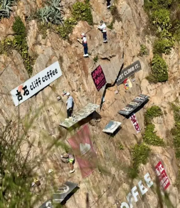 影片顯示,顧客身穿安全裝備、繫上安全帶坐在固定於崖壁的「座位」上悠閒喝咖啡,腳下即是浩瀚海面,身旁岩壁則懸掛著「古石咖啡 Cliff Coffee」的橫額,場面相當驚險。也有顧客在教練陪同下,沿著崖壁上的腳踏板緩步前行,逐步前往座位位置。