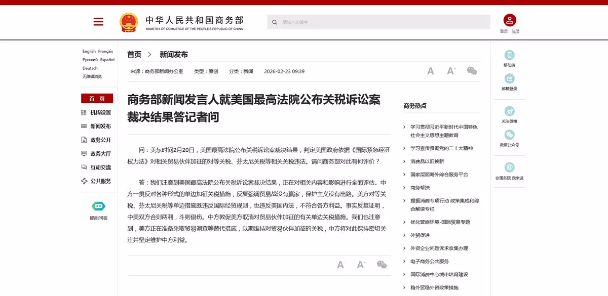 在北京,商務部回應美國聯邦最高法院裁定特朗普政府加徵關稅違法,發言人說,正全面評估相關內容和影響。