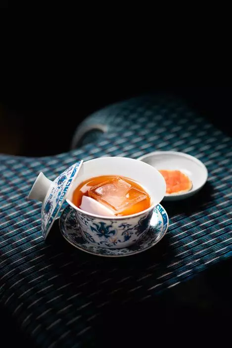 還有,結合龍舌蘭、中國白酒、五味雜陳閉月羞花、薑片、青檸和蔥花的燒味(港幣$138),加入以雞湯而成的泡沫,帶來鹹香惹味、猶如蔥油雞的滋味。