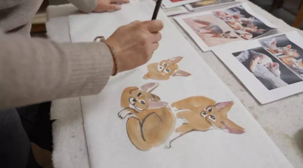 她在示範時解釋道:「我在畫這些小狐狸,我尋求一種方法,要用最少的筆墨,盡可能多地展現出這些小傢伙們突出的特點。它們的眼神要看你的心裡,同時你和它也要有心靈上的交匯。」
