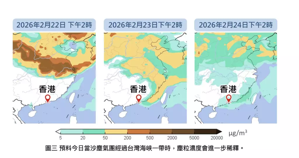 天文台說,參考世界氣象組織的沙塵預報區域專業氣象中心網站集合預報,預料今日當沙塵氣團經過台灣海峽一帶時,塵粒濃度會進一步稀釋。根據現時評估,即使廣東沿岸受偏東氣流影響,因沙塵而令能見度顯著下降的可能性較低,天文台會密切監察最新情況。