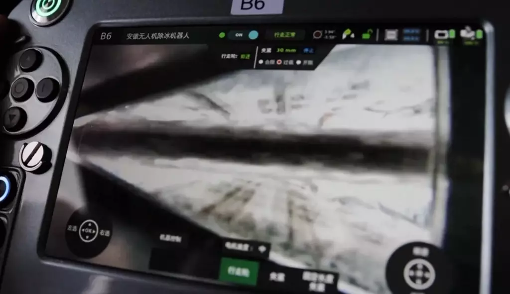 除冰作業方面,工作人員採用由無人機空運的除冰機械人,有效清除電線上的冰雪。該機械人放置在地線上,可通過遙控器操作,自主鑿除冰層。整條長達20米、被冰覆蓋的電線,在約一分鐘內便完全清除乾淨。