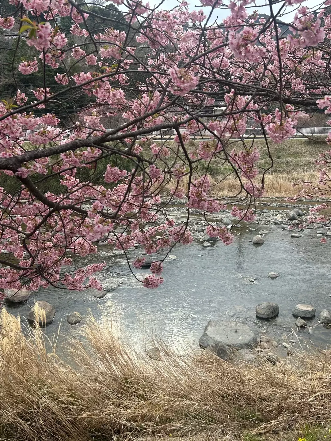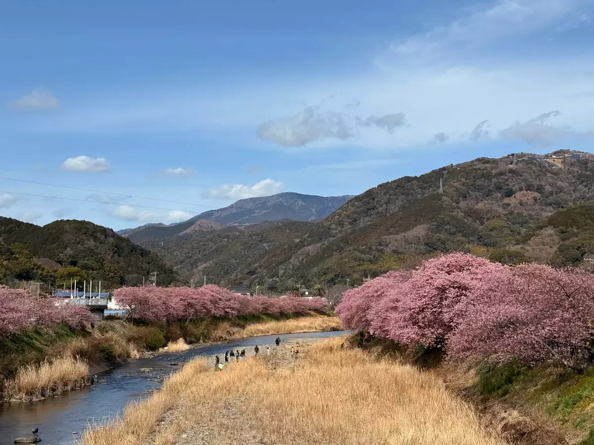 而伴隨「首場春風」帶來的暖意,東日本著名的早開品種「河津櫻」也迎來最佳觀賞期。其發祥地靜岡縣河津町的河津川沿岸,櫻花林蔭道已化為夢幻的粉色隧道。剛剛過去的周末適逢日本三連休假期,現場賞花遊客絡繹不絕。