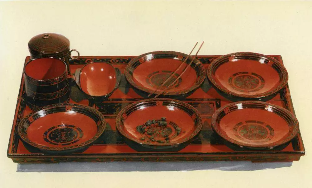 西漢貴族分食制標準食具,雲紋漆案搭配精美漆盤,是貴族身份尊嚴的體現,直觀呈現秦漢貴族分食制的講究,與平民飲食形成鮮明對比。