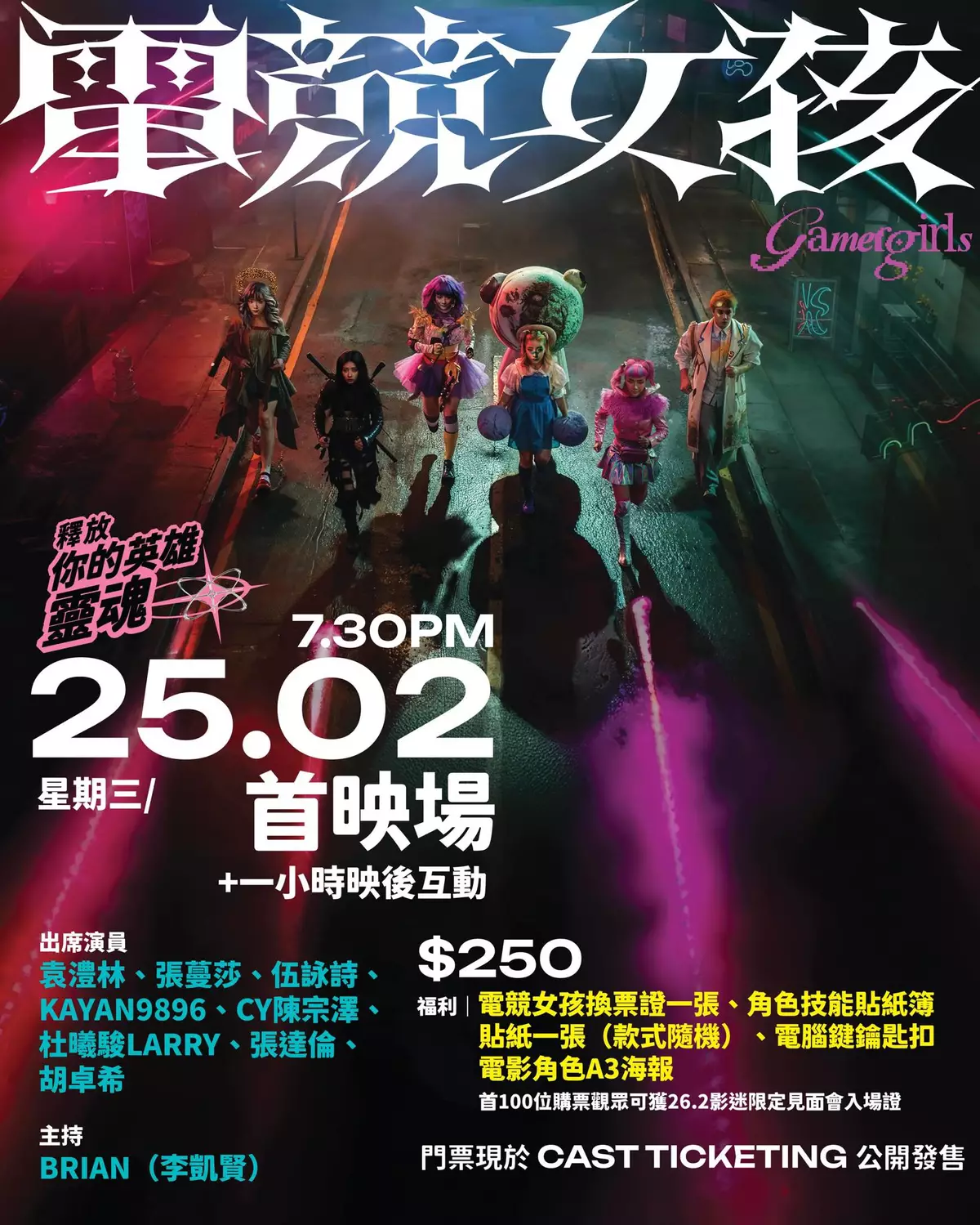 門票即日起於CAST Ticketing公開發售,每場門票不論票價均贈送各式電影特別版禮品,每款都帶有團隊的心思。另大會特設兩款特別版隊員證:「Gamer Girls 隊員證」【限量50位】及「電競茶餐廳隊員證」【限量100位】,將入場觀眾升級成真正「玩家」。詳情請參閱 CAST 網站: https://www.tickets.cast-event.com/zh-hant/ 及電競女孩 IG,FB及 Threads等。整個麥花臣活動由放映、分享會、音樂表演到拍照互動,希望能為觀眾帶來另一種觀賞電影體驗,讓每位現場觀眾都可以釋放自己的英雄靈魂,和 Gamer Girls 一起集結上陣,見證《電競女孩》這幾年的經歷及成長。