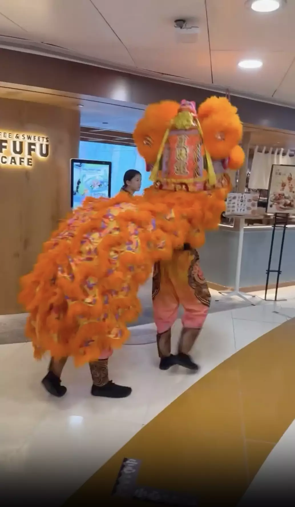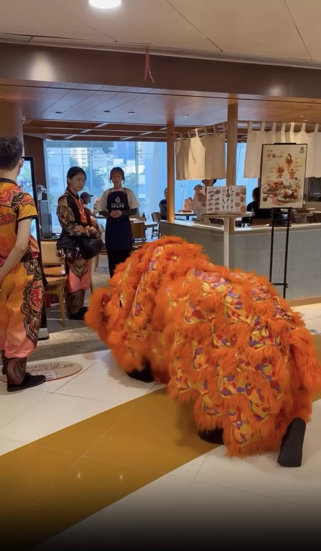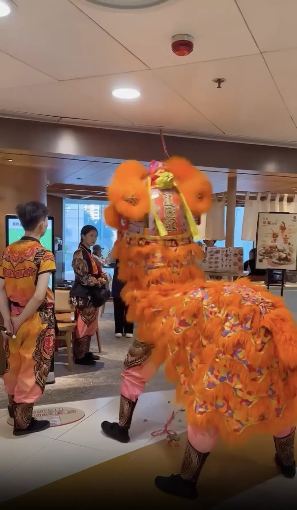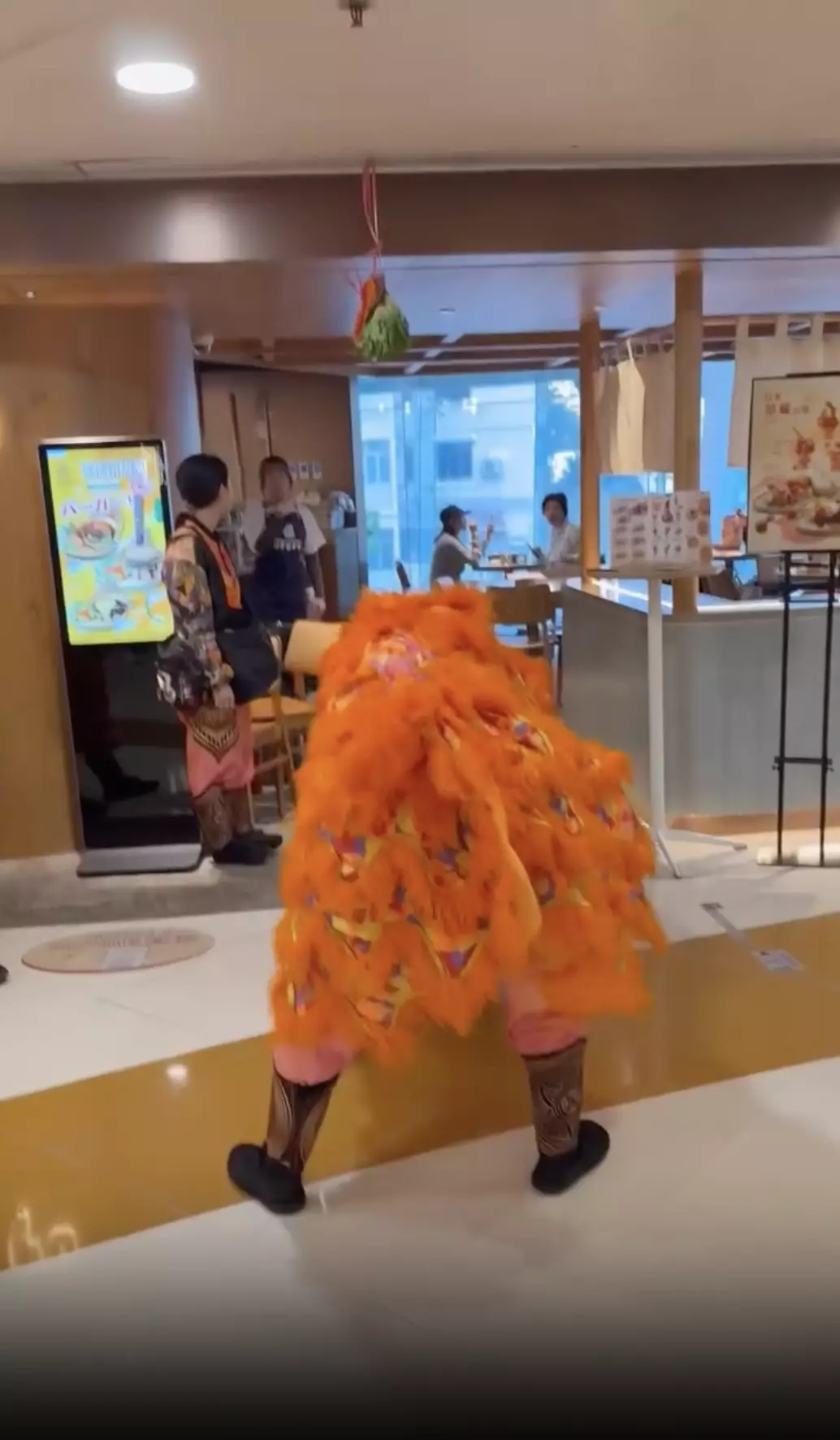 有網民日前在社交平台threads上載荃灣某商場的醒獅表演影片,片中可見,一隻橙色醒獅在商場走廊為店舖採青時,動作簡單,當靠近懸掛的生菜時,竟有隊友從旁上前將生菜「剪」下,再交給獅頭。