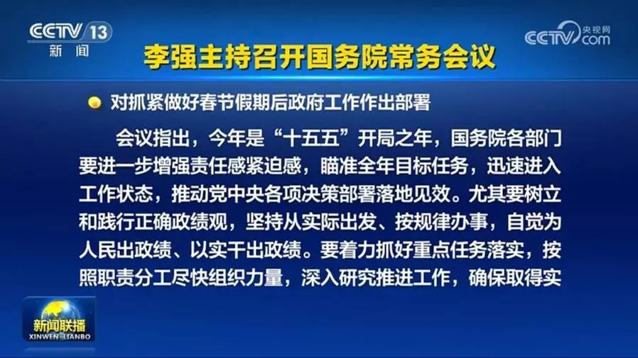 國務院總理李強主持召開國務院常務會議,對抓緊做好春節假期後政府工作作出部署。會議指出,今年是「十五五」開局之年,國務院各部門要進一步增強責任感緊迫感,瞄準全年目標任務,迅速進入工作狀態,推動黨中央各項決策部署落地見效。