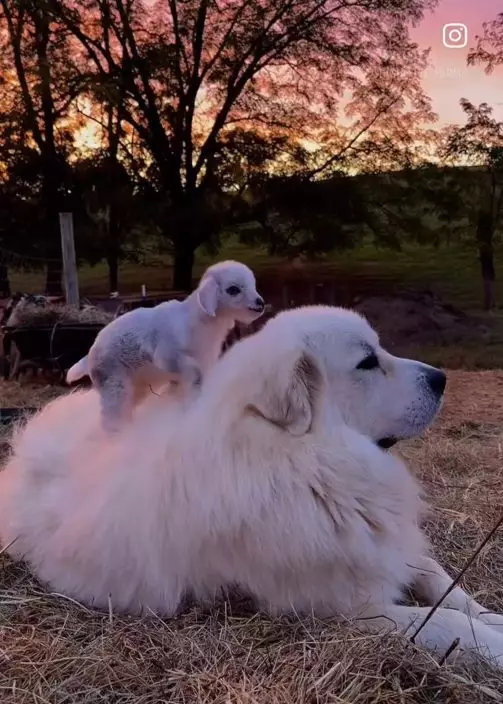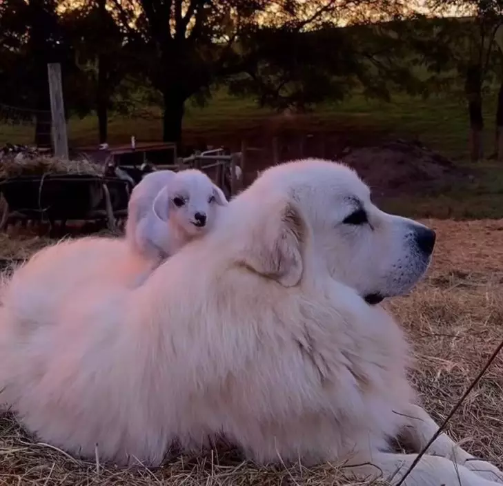 農場小山羊依偎大比利牛斯犬入睡撒嬌畫面勁療癒。IG圖片