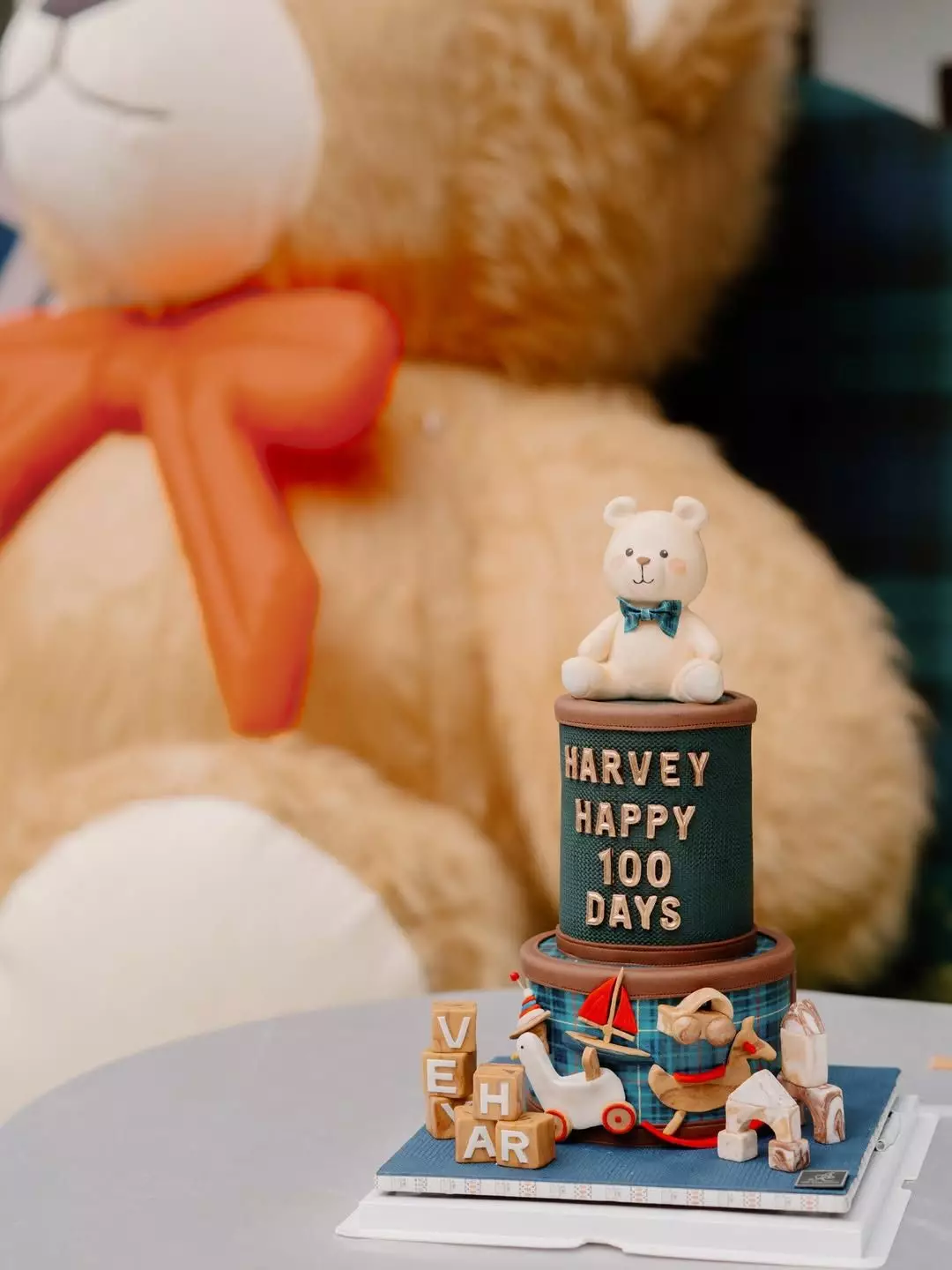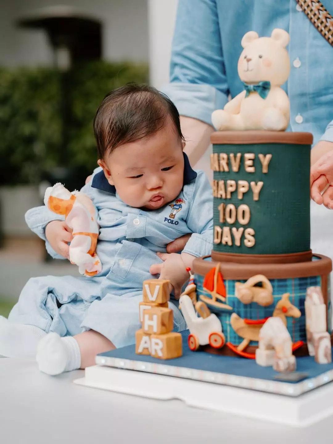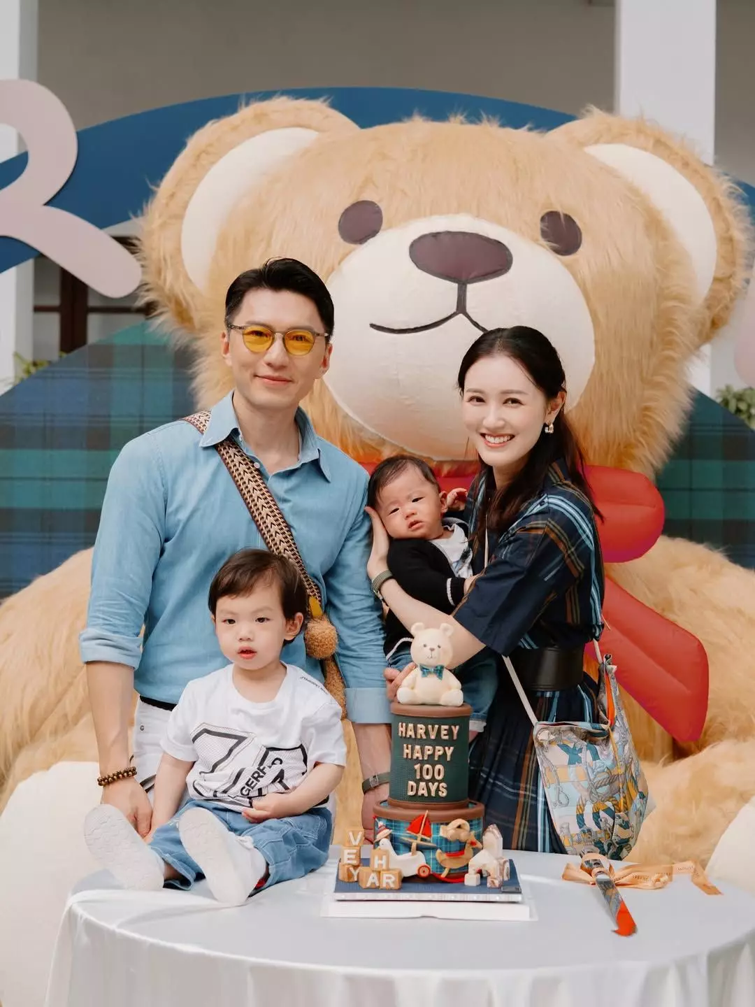 相中可見,百日派對以熊仔做主題,現場擺放了一個巨形熊仔做背景,還有一個雙層的熊仔造型蛋糕,一家四口齊齊穿上藍色Tone的服飾,拍下多張幸福又溫馨的合照。張寶兒留言為袁氹氹送上生日祝福:「袁氹氹100天生日快樂!感謝所有叔叔姨姨哥哥姐姐,在年初五這個陽光普照的溫暖下午來相聚(放棄旅遊來陪我們,真的很感動)。願袁氹氹健康成長,像哥哥一樣聰明伶俐,願兩兄弟相親相愛,父母繼續智慧和荷包皆增長。」