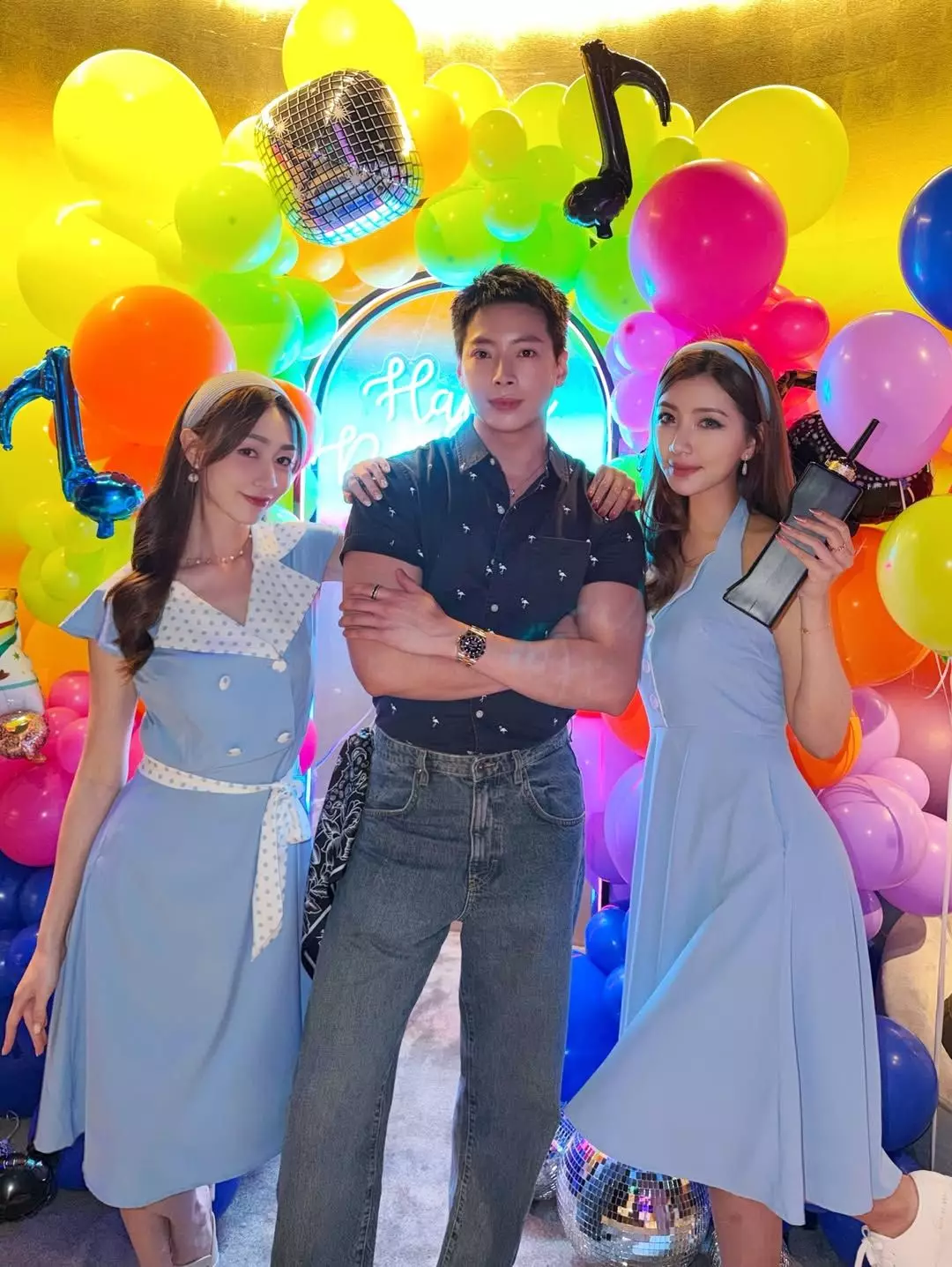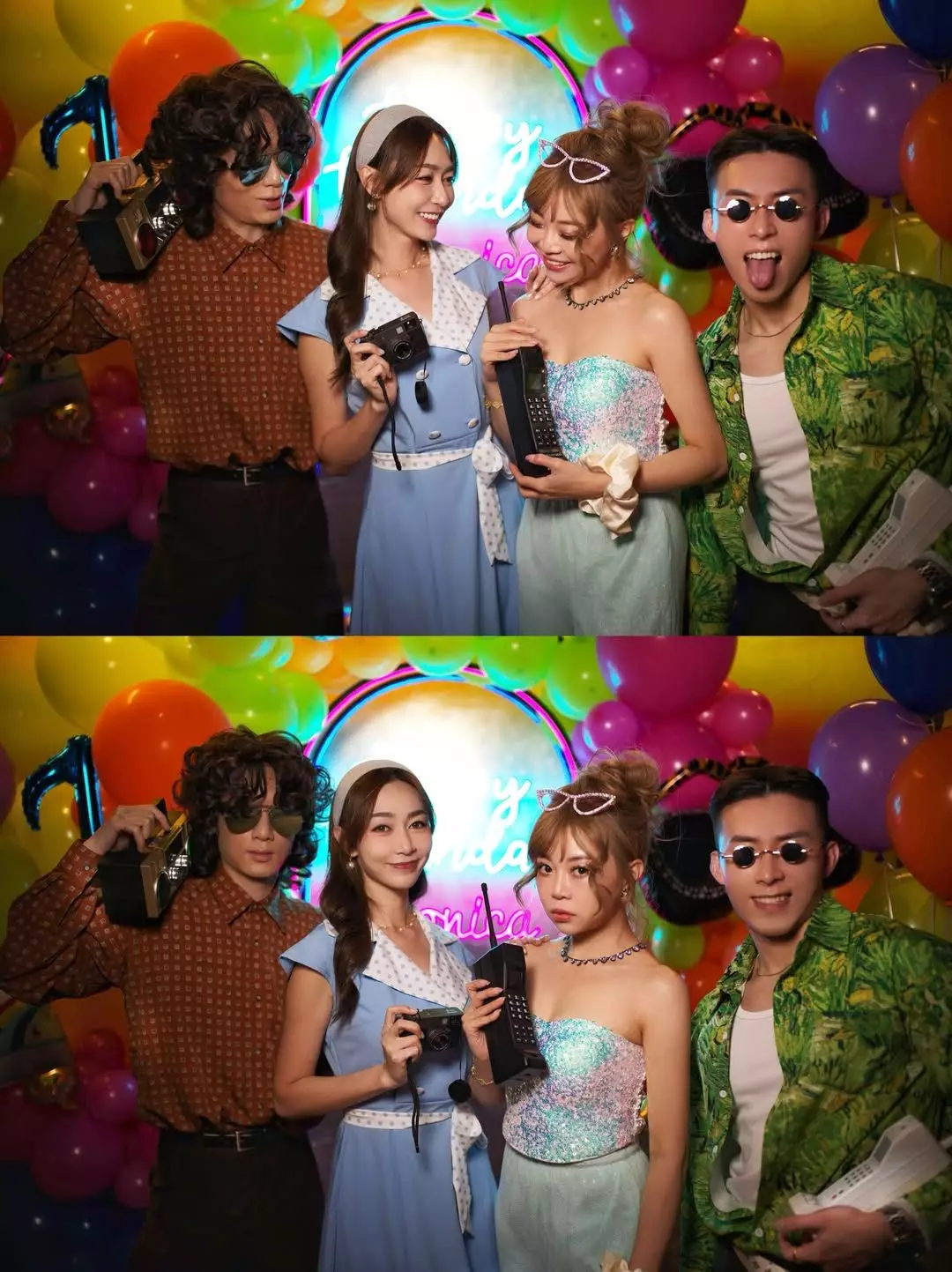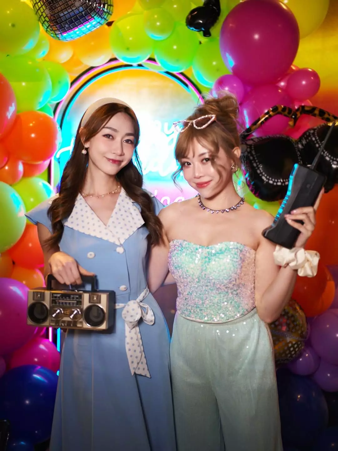 相中可見,派對以懷舊Disco為主題,黃嘉雯穿上藍白色波點連身裙,搭配粗邊髮箍,變身「陳寶珠」,而同場的譚嘉儀則一身Pink Lady打扮,二人又唱又跳,還拿着巨型收音機、「大哥大」及懷舊相機等道具擺pose拍照,相當有Feel!
